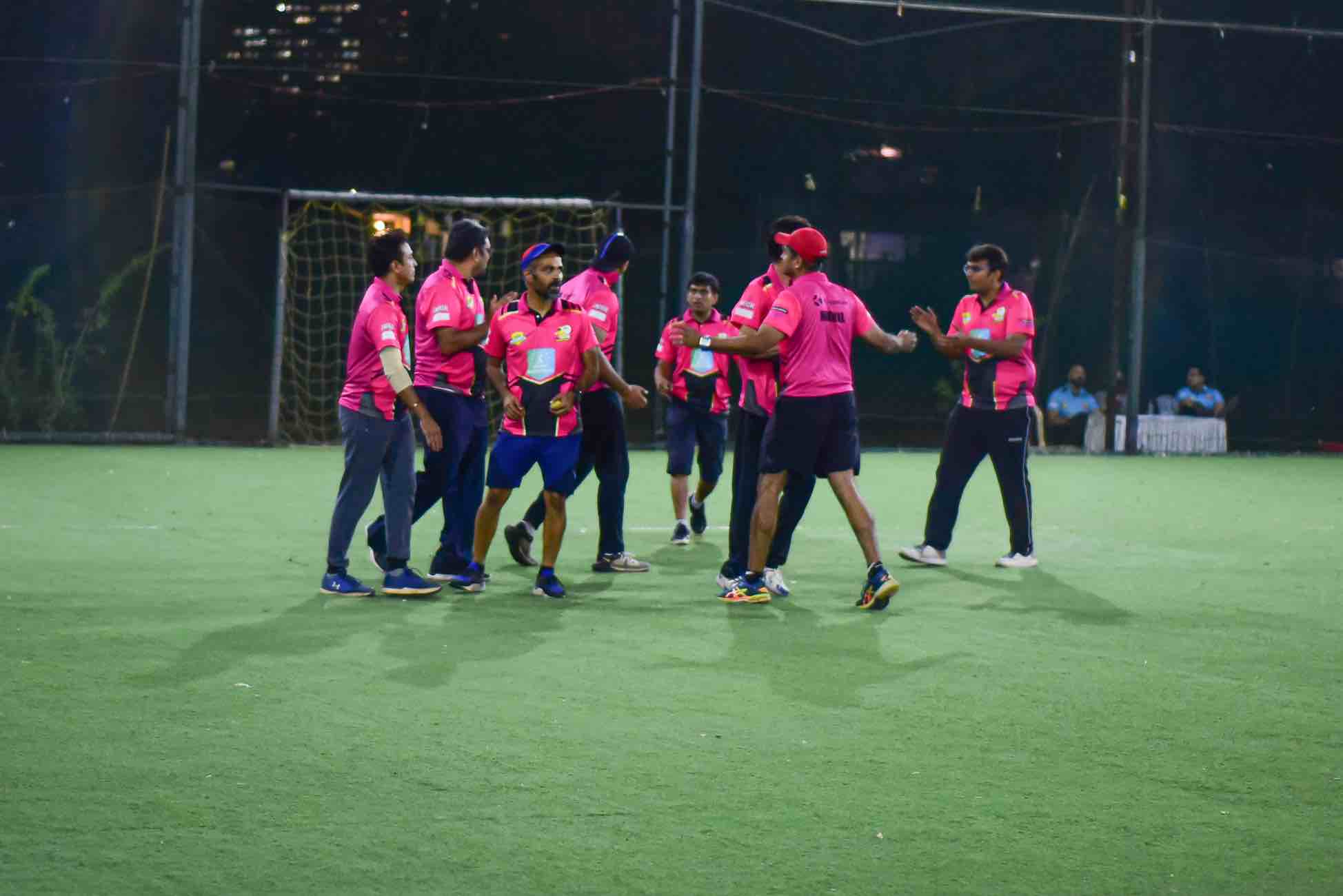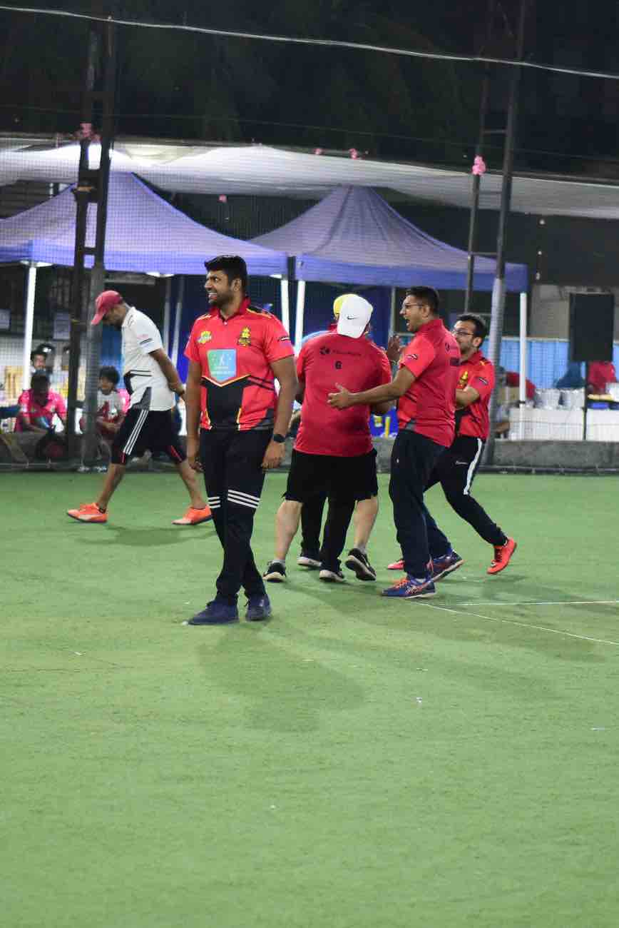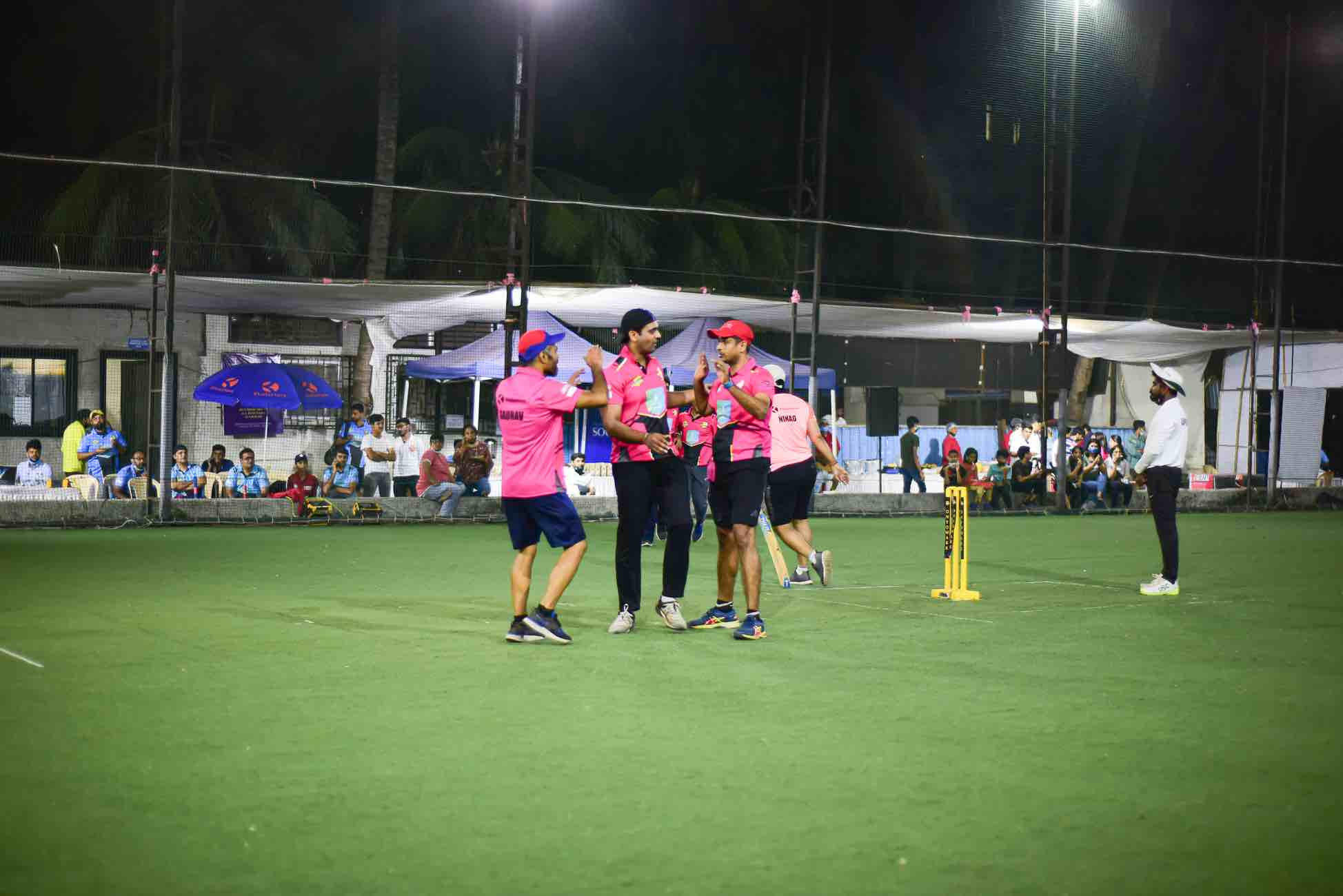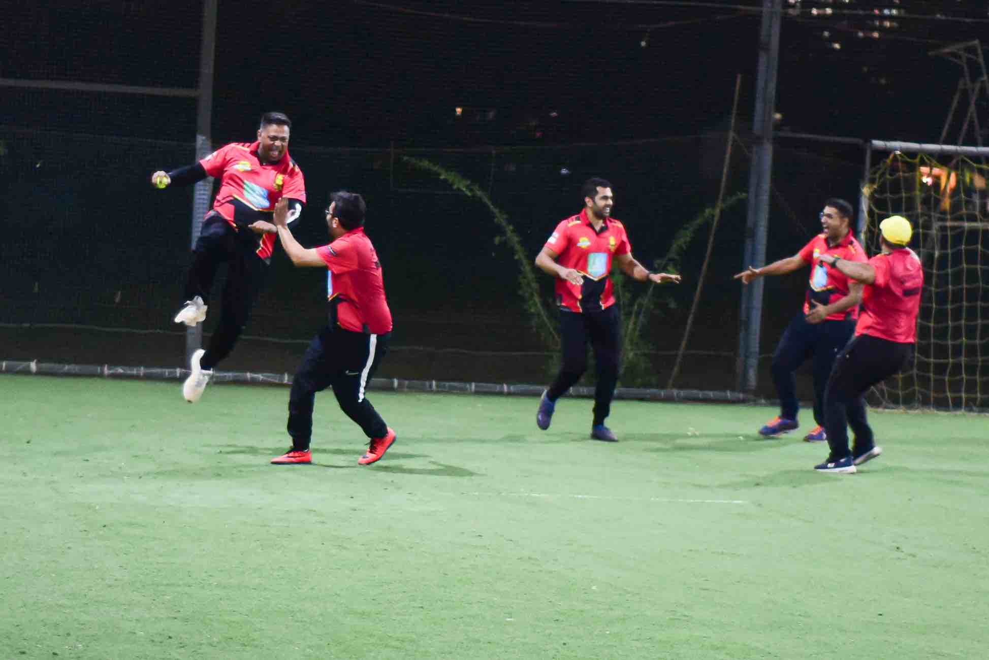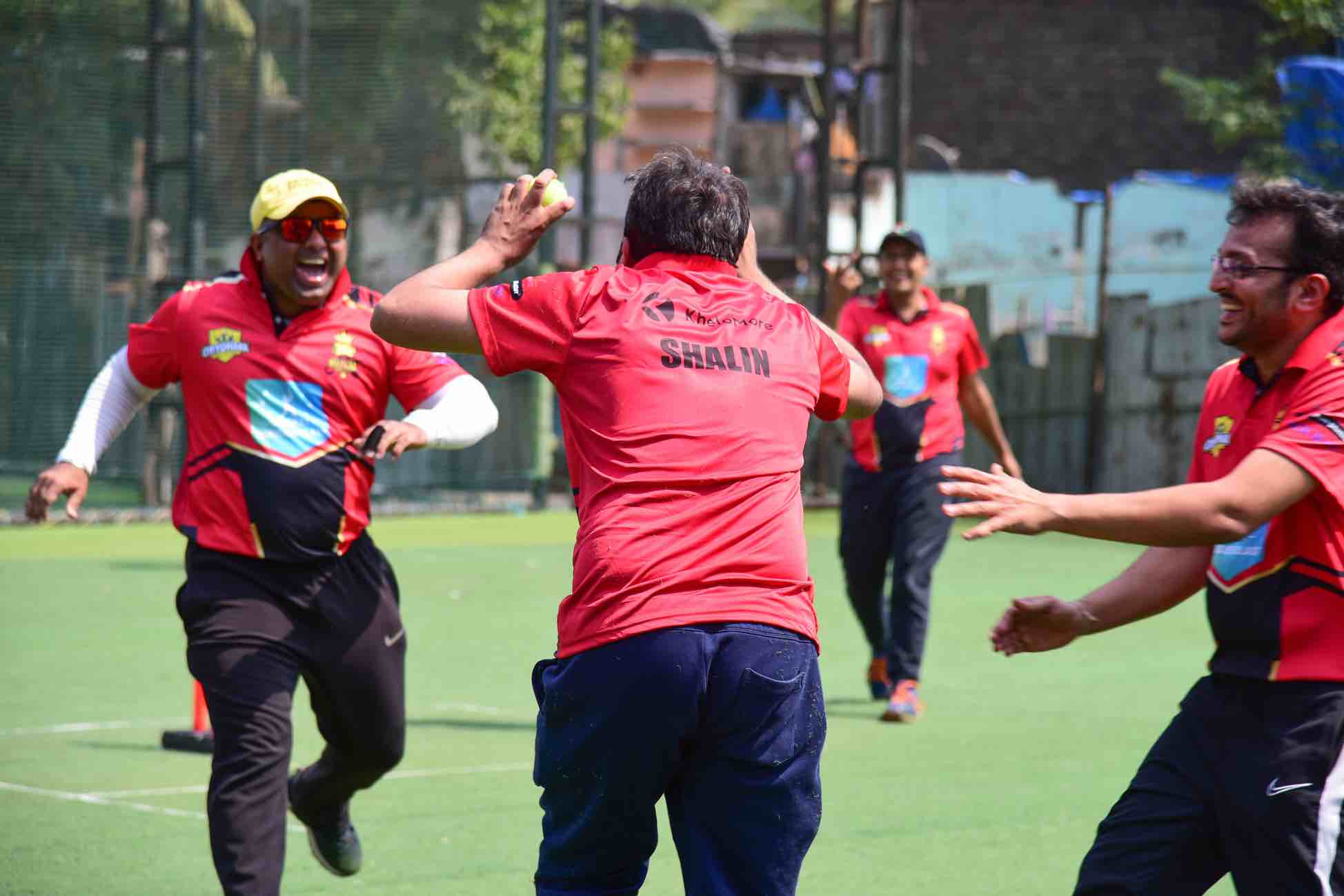 Ankour Mehta- 47/1 (1.5), Vatsal Shah- 51/2 (2.5), manish jawkar- 90/3 (7.0), gaurang bhasin- 93/4 (7.3), Jimit Sanghavi- 98/5 (7.5), Minesh Adani- 98/6 (8.0)